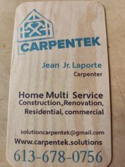Bonjour,merci pour votre interet je suis JeanJr.Laporte, j'ai plus de 33 ans d'experience dans le millieu de la Construction,j'ai travaillé pour les compagnies local et pour les plus grosse compagnie du Canada j'ai participé à de petit projets jusqu'à des MEGA projets. Je suis heureux d'offrir mes Service et mon expérience de menuiseries, pour la region de Prescott and Russell et S.D.G Ontario, touts genre de projet, intérieur, extérieur, petit et gros.